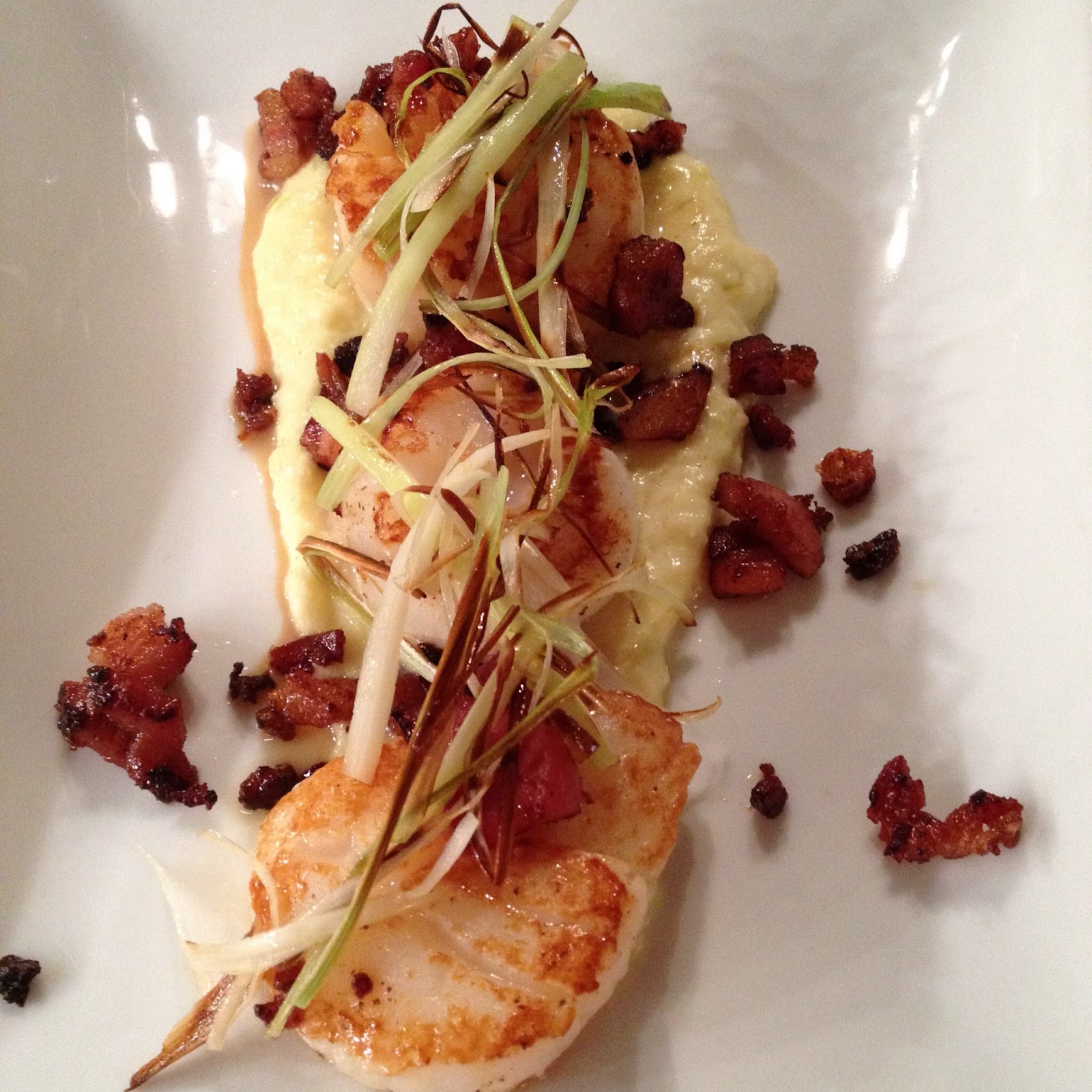 As an old married couple (this was our second Valentine's Day as husband and wife) we now take the opportunity to get some of my hubbie's favourite things to cook at home. After watching countless episodes of Hells Kitchen I wanted to give scallops a go and selected a recipe from Gino d'Acampo's book, Buonissimo: Scallops with matchstick leeks and crispy pancetta. The scallops were served on an onion purée with a sprinkling of crispy pancetta and leeks. The sweetness of the caramelised onion puree was surprising but it went very well with the juicy scallops, beautifully browned in the pancetta fat in the pan.