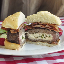 The great grilling continues with another winning combination in a stuffed burger. This time some locally made queso fresco artisan cheese from Five Brothers Cheese gets layered with diced fresh jalopeno peppers and stuffed into extra lean ground beef flavored with garlic and even more jalopenos! This is a very flavorful burger with plenty of punch. Plenty of crisp bacon was the only thing my inner meat-a-tarian needed to complete this burger but next time I'm trying it with some fresh homemade salsa as a condiment.